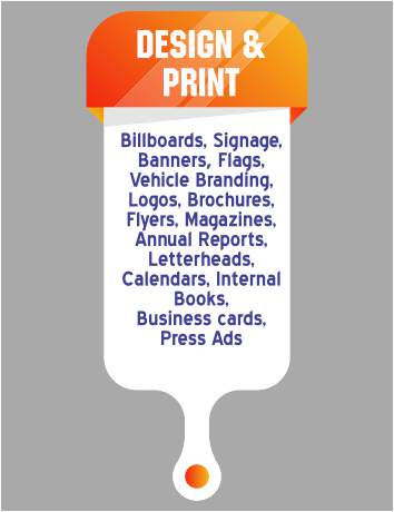 Billboards, Signage, Banners, Flags, Vehicle Branding, Logos, Brochures, Flyers, Magazines, Annual Reports, Letterheads, Calendars, Internal Books, Business cards, Press Ads