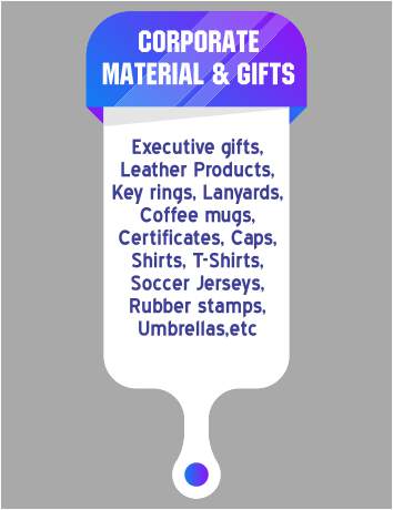Executive gifts, Leather Products Key rings, Lanyards, Coffee mugs Certificates, Caps, Shirts, T-Shirts, Soccer Jerseys, Rubber stamps, Umbrellas